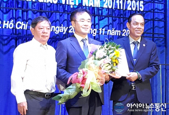 지난 22일 베트남 호치민시 투득과학대학 대강당에서 열린 제30회 스승의 날 행사에서 이호성 영남이공대학교 총장(가운데)이 베트남 교육발전을 위한 공로를 인정받아 베트남 정부로부터 훈장을 수여받고 기념촬영을 하고 있다. 왼쪽은 호치민시 인민위원회 문화사... 2015-11-25