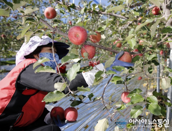 25일 충남 태안군 태안읍 장산리‘장산농원’에서 한 아낙네가 부사 사과를 수확하고 있다.(사진제공=태안군청) 당도 높은 충남 태안산 부사 사과가 출하되기 시작했다. 25일 태안군에 따르면 장산리의 사과농장 ‘장산농원’(3만㎡)에... 2015-11-25