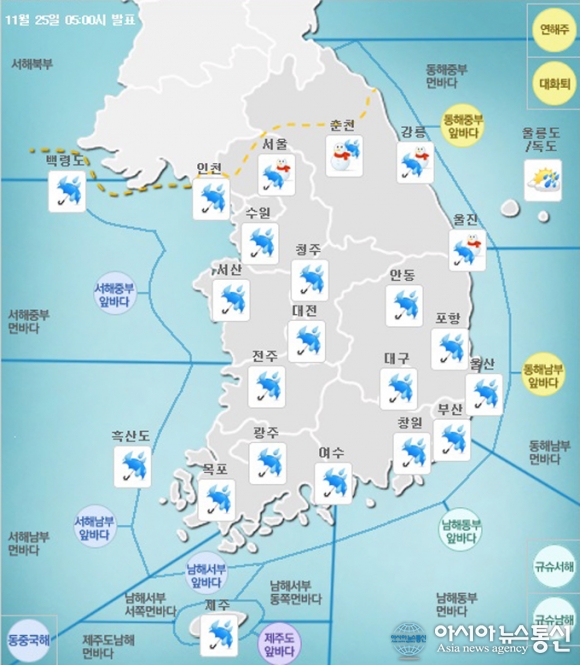 오늘날씨./사진=기상청 홈페이지 캡처 오늘은 전국이 흐리고 비가 내리는 가운데 강원 산간에는 대설특보가 발효 중이다. 25일 기상청에 따르면 서울에도 새벽 빗발에 눈이 섞인 진눈깨비가 관측돼 올해 초 이후 첫눈을 기록했다. 이날 전국이 서... 2015-11-25