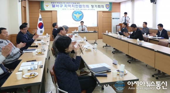 24일 오후 달서경찰서 2층 소회의실에서 달서경찰서가 달서구청, 남부교육지원청, 달서소방서, 달서우체국 등 유관기관 및 지역 단체 관계자 30여명이 참석한 가운데 달서구 지역치안협의회 정기회의를 개최하고 있다.(사진제공=달서경찰서) 대구달서... 2015-11-25