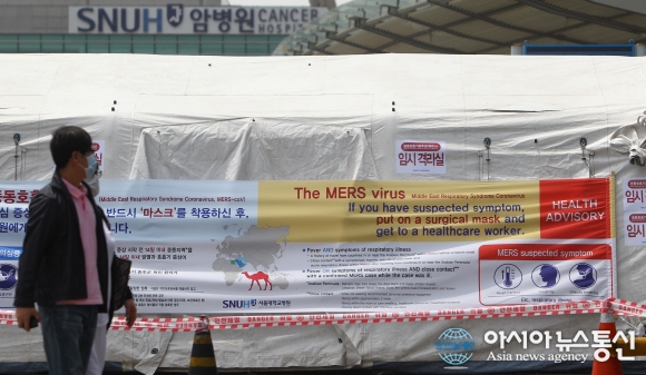 임시격리실 앞을 마스크를 착용한 한 남성이 지나가고 있는 모습./아시아뉴스통신DB 국내 마지막 중동호흡기증후군(메르스) 감염자였던 80번째 환자가 172일간의 투병 끝에 숨졌다. 25일 보건복지부 중앙메르스관리대책본부에 따르면 80번째 환자는 이... 2015-11-25