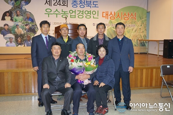 24일 충북도농업인회관 대강당에서 열린 제24회 충북도 우수농업경영인 대상 시상식에서 우수농업경영인 대상을 받은 영동군 학산면의 양재만씨(앞줄 가운데)가 수상 후 기념촬영하고 있다.(사진제공=영동군청) 24일 충북도농업인회관 대강당에서 열... 2015-11-25