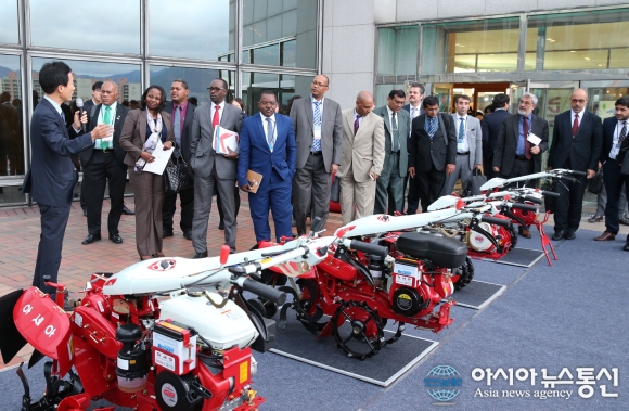 24일 오후 지구촌 새마을지도자 통합대회에 참석한 세계 각국의 장.차관들이 농기계 전시장을 관람하고 있다.(사진제공=대구시청) '제2회 지구촌 새마을대회(GSLF 2015)' 행사의 일환으로 행사 참가국 장.차관들이 농기계제조사인 대동공업과 아세... 2015-11-24