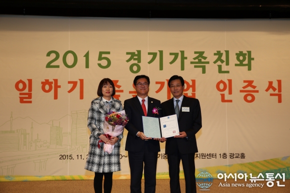 24일 오후 경기도 중소기업종합지원센터에서 열린 '일하기 좋은 기업 인증식'에서 수원시시설관리공단이 '2015년 경기가족친화 일하기 좋은 기업(GGWP)'에 선정됐다.(사진제공=수원시시설관리공단) 수원시시설관리공단이 24일 경기도 지정... 2015-11-24
