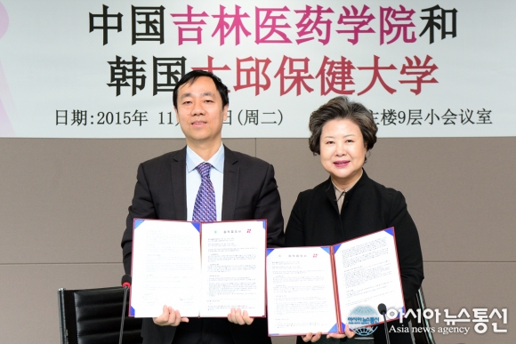 24일 대구보건대학교 본관 회의실에서 남성희 대구보건대 총장(오른쪽)과 채건휘 길림의약대학 총장(왼쪽)이 MOU를 체결한 후 기념촬영을 하고 있다.(사진제공=대구보건대학교) 대구보건대학교(총장 남성희)가 중국 간호학과 학생들에게 의료한류를 전... 2015-11-24
