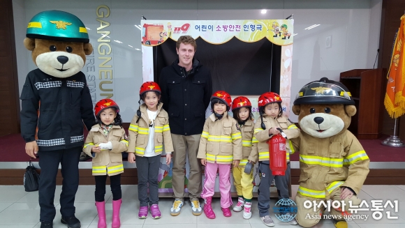 24일 강릉소방서(서장 정은철)는 오전 10시 키즈칼리지 유치원 원생 및 교사 30명을 대상으로 화재예방인형극 공연, 소방차량 관람, 소화기사용법 체험등 소방안전교육을 실시하고 있다.(사진제공=강릉소방서) 2015-11-24