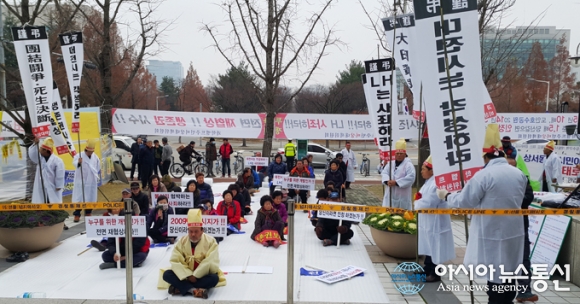 대전 신동·둔곡지구 국제과학비즈니스벨트 주민들이 24일 대전시청 북문 앞에서 상여소리와 함께 ‘죽은 시정’에 대해 장례를 치르고 있다. 이들은 토지보상과 관련 재검토를 요구하고 있다./아시아뉴스통신=김일환 기자 북망산천이 머다... 2015-11-24