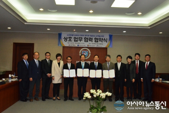 24일 선문대와 대전시교육청, 한국마이크로소프트사, 정보통신윤리학회가 상호교류협력 협약식을 가졌다. 왼쪽 5번째부터 인센트 왕 한국마이크로소프트사 전무·황선조 선문대 총장·설동호 대전시교육감·박정호 정보통신윤리학회장.(사진제공=선문대... 2015-11-24