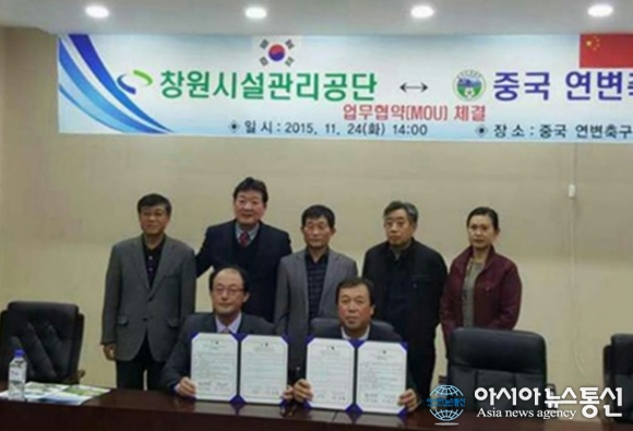 23일 중국 연변축구협회 사무실에서 박창규 창원시설공단 본부장과 이동철 연변축구협회장 등 관계자들이 업무협약을 체결한 후 기념촬영을 하고 있다.(사진제공=창원시설공단) 경남 창원시설공단(이사장 김용철)이 해외 전지훈련팀 유치를 통한 지... 2015-11-24