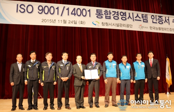 24일 오전 경남 창원시 마산올림픽기념관에서 김용철 창원시설공단 이사장 등 임직원들이 한국능률협회인증원 박기호 대표이사로부터 ISO 인증서를 받은 뒤 기념촬영을 하고 있다.(사진제공=창원시설공단) 경남 창원시설공단이 국제표준 규격의 ISO 900... 2015-11-24