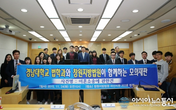 24일 오전 창원지방법원 마산지원 제204호 법정에서 경남대학교 법학과와 창원지법마산지원이 마련한 모의재판이 열린 후 전상훈 창원지법 마산지원장과 김지환 법학과 학과장, 학생 등이 기념사진을 촬영하고 있다.(사진제공=경남대) 경남대학교 법... 2015-11-24