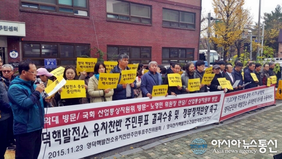 23일 오전 영덕핵발전소 유치찬반주민투표 추진위원회와 영덕핵발전소반대범군민연대 등 주민 20여명이 서울 청운동 효자주민자치센터 앞에서 기자회견을 갖고 "주민투표 결과 수용과 영덕 천지원전 1,2호기 건설 계획 전면 재검토"를 촉구하고 있다.(사진제공... 2015-11-24