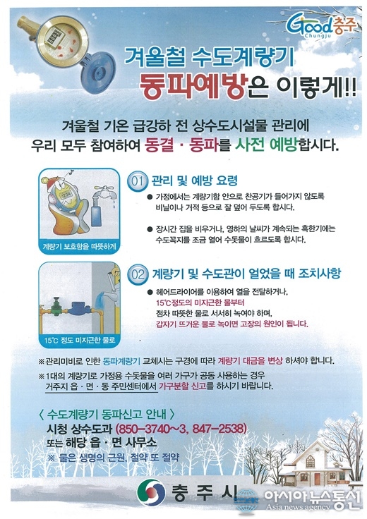 충북 충주시 상수도계량기 동파방지 예방 홍보물.(사진제공=충주시청) 충북 충주시가 겨울철 상수도 동파 등으로 인한 시민불편을 최소화하기 위해 지난 16일부터 다음해 2월까지 상수도 동파대비 대책반 운영에 들어갔다. 시는 시설물 안전점검과 ... 2015-11-24