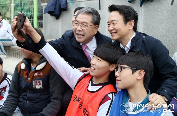24일 오전 수원 세류중학교에서 열린 '굿모닝 꿈의 학교'를 방문한 남경필 경기도지사와 이재정 경기도교육감이 학생들과 셀카를 찍고 있다.(사진제공=경기도청) 남경필 경기도지사가 도와 교육청 간 교육협력사업의 일환으로 추진 중인 '... 2015-11-24