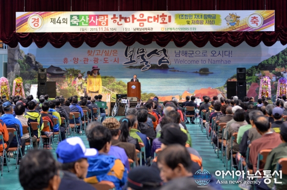 24일 경남 남해실내체육관에서 ‘남해군 제4회 축산사랑 한마음 대회’ 개회식이 열리고 있다.(사진제공=남해군청) 경남 남해군 남해실내체육관에서 24일 ‘제4회 축산사랑 한마음 대회’가 열렸다. 남해축협(조합장 최종열)이 주최∙... 2015-11-24