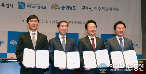 24일 4개 지자체장들이 서울 프레스센터에서 지역에너지 전환을 위한 공동선언문을 발표했다. 왼쪽부터 안희정 지사·박원순 시장 ·남경필 지사·원희룡 지사.(사진제공=충남도청) 지역별 에너지정책과 사례를 공유하는등 에너지 상생 시... 2015-11-24