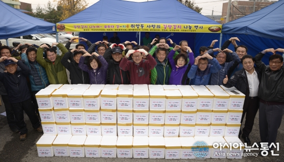 24일 논산시 소재 기관․단체 회원 및 임직원, 자원봉사자 등 100여명은 취암동에서 김장나눔행사를 가졌다. 이날 담근 김치는 지역내 독거노인 및 장애인 가구 등 어려운 이웃 120여 가구에 전달했다.(사진제공=논산시청) 2015-11-24