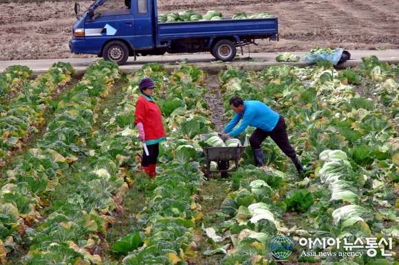 24일 경북 울진지방을 비롯 동해연안에 지난 6일부터 겨울을 재촉하는 늦가을비가 쉬임없이 내리면서 배추, 무 등 김장작물이 물러지는 등 밭작물 피해가 확산되고 있는 가운데 가을비가 잠시 긏자 울진군 근남면 수곡리 '바깥잘미' 마을에서 농부 부부가 ... 2015-11-24