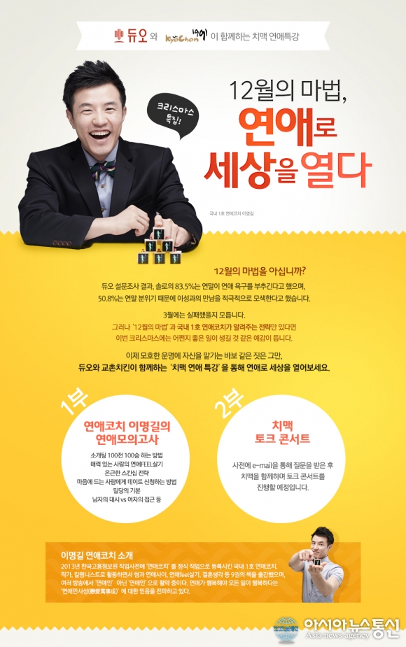 듀오 솔탈 프로젝트 포스터.(사진제공=듀오) 이번 다가오는 크리스마스를 앞두고 싱숭생숭한 솔로들을 위한 특별한 ‘솔탈 프로젝트’가 진행된다. 국내 1위 결혼정보 회사 ‘듀오(대표 박수경)’가 교촌치킨과 함께 12월 5일(토) 미... 2015-11-24