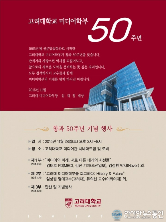 관련 포스터.(사진제공=고려대학교) 고려대학교 미디어학부는 오는 28일(토) 오후 2시부터 고려대 미디어관에서 '창과 50주년 기념행사'를 개최한다. 이날 행사는 총 3부로 진행된다. ▶1부는 "미디어의 미래, 서로 다른 네 개의 시선들"... 2015-11-24