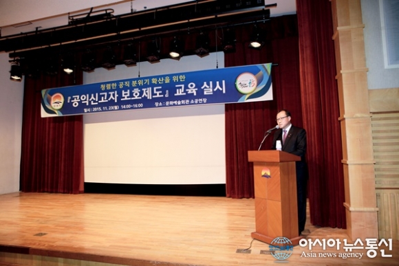 23일 김영박 경북 김천시 감사홍보담당관이 문화예술회관 소공연장에서 소속공무원 200명을 대상으로 열린 청렴한 공직 분위기 확산을 위한 '공익신고자 보호제도' 청렴교육에 참석해 설명하고 있다. 이날 교육은 지난 8월13일 '김천시 공익신고자 보호 및 공... 2015-11-24
