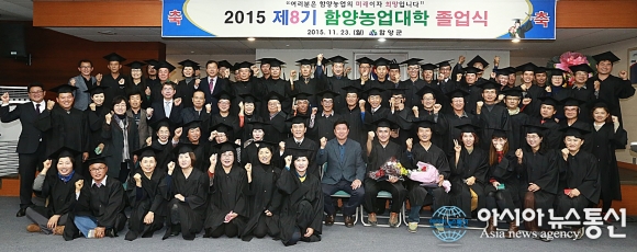23일 경남 함양군 농업인교육관에서 ‘제8기 함양농업대학 졸업식’을 갖고 기념촬영 모습.(사진제공=함양군청) 맞춤형 핵심농업인을 양성한다는 목표아래 8년째 농업대학을 운영해온 경남 함양군이 군민소득 3만 달러 시대를 이끌 전문농업경... 2015-11-24
