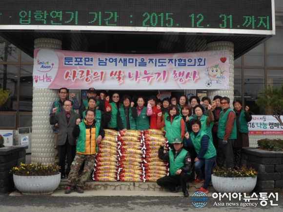 충남 아산시 둔포면 남녀 새마을지도자회는 23일 둔포면사무소 앞마당에서 사랑의 쌀 나누기 행사를 실시했다.(사진제공=아산시청) 충남 아산시 둔포면 남‧녀 새마을지도자회(회장 김광국, 부녀회장 유영숙)는 23일 남녀지도자 40여 명이 모인 가운... 2015-11-24
