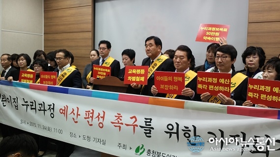 24일 충북어린이집 연합회 임원들이 충북도청 브리핑실에서 어린이집 누리과정 예산 편성을 촉구하는 기자회견을 하고 있다. 충북어린이집 연합회는 24일 충북도 교육청에 2016년 어린이집 누리과정 예산 편성을 강력히 촉구했다. 충북어린이집 연... 2015-11-24