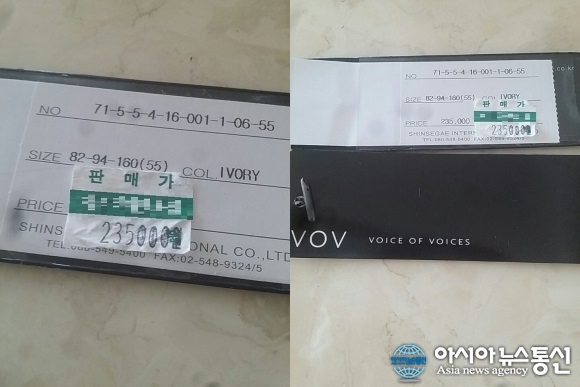 A씨가 구입한 상품. 판매가격 딱지에 적힌 가격과 정가가 동일하게 적혀 있어 할인행사에 대한 신뢰성이 의문시되고 있다./아시아뉴스통신=최 솔 기자 #. A씨는 최근 황당한 일을 겪었다. A씨는 백화점 내 의류브랜드 매장 할인행사에서 23만5000원을 주... 2015-11-23