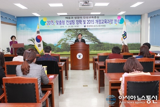 24일 충북 보은교육지원청(교육장 한응석.가운데 연단)은 청내 대회의실에서 관내 초・중・고 교감과 교사 60여명을 대상으로 ‘인성교육중심 컨설팅 장학 및 2015 개정교육과정 연수’를 실시했다.(사진제공=보은교육지원청) 충북 보은... 2015-11-24