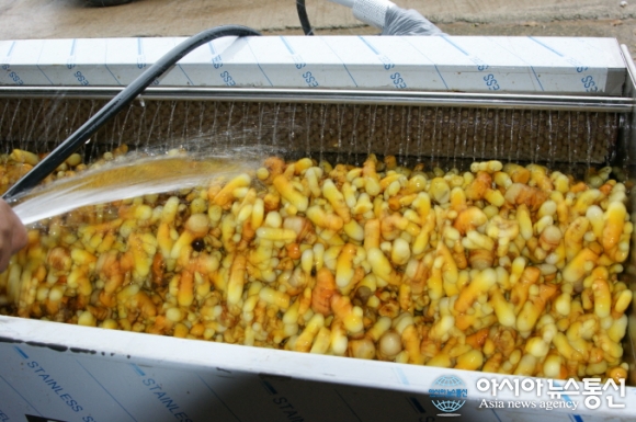 사진은 수확한 울금을 세척하고 있는 장면. (사진제공= 청양군청) 충남 청양군내 2.5ha 30여 농가들이 최근 카레의 원료가 되는 울금 수확이 한창이다. 24일 군에 따르면 울금은 기후변화대응 아열대 신소득 작목으로 소비자의 웰빙 욕구에 부합하기 위... 2015-11-24