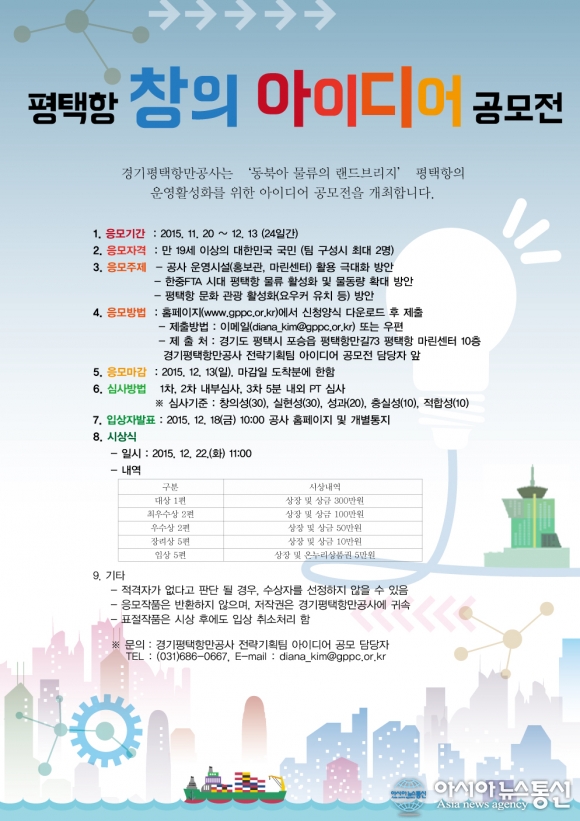 24일 경기평택항만공사(사장 최광일)는 평택항 발전을 위해 대국민 ‘평택항 창의 아이디어 공모전’을 실시한다고 밝혔다. 사진은 홍보 포스터.(사진제공=평택항만공사) 경기평택항만공사(사장 최광일)는 24일 평택항 발전을 위해 대국민 ‘... 2015-11-24