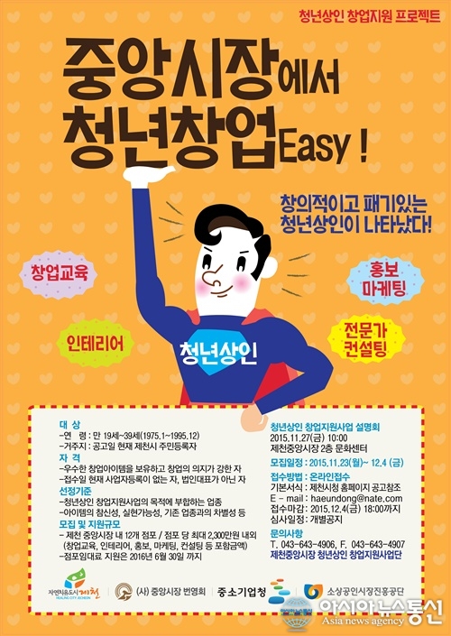 충북 제천시 ‘청년상인 창업지원 프로젝트’ 포스터.(사진제공=제천시청) 충북 제천시와 제천중앙시장 청년상인창업지원사업단이 다음달 4일까지 중앙시장 내 창업을 원하는 청년상인 12인(팀)을 모집한다. 중앙시장 청년상인창업지원사업... 2015-11-24