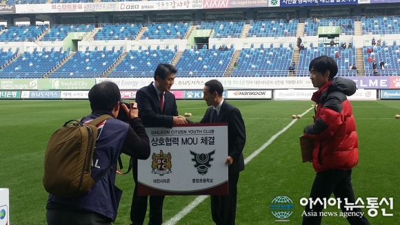 지난 21일 대전중앙초등학교 축구부는 대전시티즌과 대전월드컵경기장에서 인재육성 협력 체제 구축을 위한 MOU를 체결했다.(사진제공=대전중앙초등학교) 대전중앙초등학교(교장 이병의) 축구부와 대전시티즌(대표이사 전득배)은 지난 21일 대전월... 2015-11-24