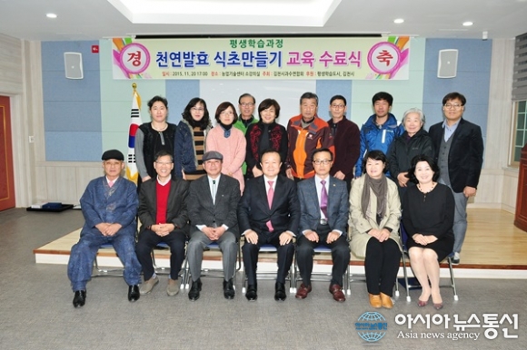 지난 20일 박보생 경북 김천시장이 농업기술센터 소회의실에서 열린 '천연발효식초만들기 교육과정 수료식'에 참석해 관계자들과 기념사진을 찍고 있다. 이번 교육은 김천시과수연합회 지난 9월부터 시작돼 총 64시간 동안 식초이론 및 실습, 활용방법과 농가 마... 2015-11-24