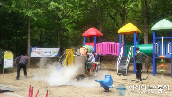어린이 모래놀이터 소독장면. 이 기사와 관련 없음./아시아뉴스통신=최 솔 기자 충남도는 지난 4월부터 도내 모래놀이터를 점검한 결과 부적합 시설 1곳을 찾아 해당 시·군을 통해 조치했다고 24일 밝혔다. 이번 점검은 도와 시·군이 합동... 2015-11-24