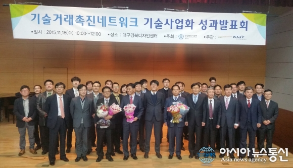 18일 대구디자인센터에서 열린 기술거래촉진네트워크사업 성과발표회에서 기술사업화 부문 우수사례로 선정된 충남테크노파크 지역산업육성실 임직원들이 행사 참석자들과 함께 기념촬영을 하고 있다.(사진제공=충남테크노파크) 충남테크노파크(원... 2015-11-18