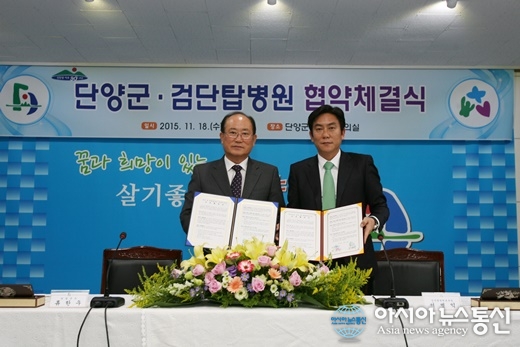 18일 충북 단양군청 2층 회의실에서 단양군-검단탑종합병원이 의료협약을 체결한 가운데 류한우 단양군수(왼쪽)와 서병익 검단탑종합병원 본부장이 기념촬영을 하고 있다.(사진제공=단양군청) 충북 단양군이 18일 단양군청 2층 회의실에서 검단탑종합... 2015-11-18
