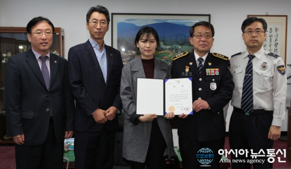 18일 상지대학교 총장실에서 경찰청에서 주최한 올바른 112신고 정착을 위한 112 UCC 공모전에서 상지대학교 디자인학부 시각․영상디자인전공 3학년 남미진 학생이 ‘112 긴급출동의 발목을 잡은 것은 허위신고 이다’라는 주제로 수상하고 있다. (왼쪽부터 상... 2015-11-18