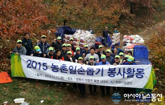 17일 경남 창원시 의창구 북면 내곡리 한 단감농장에서 창원시설공단 임직원들이 단감 수확작업을 도우며 파이팅을 하고 있다.(사진제공=창원시설공단) 경남 창원시설공단(이사장 김용철) 임직원 40여명은 17일 창원시 의창구 북면 내곡리 단감재배 농... 2015-11-18