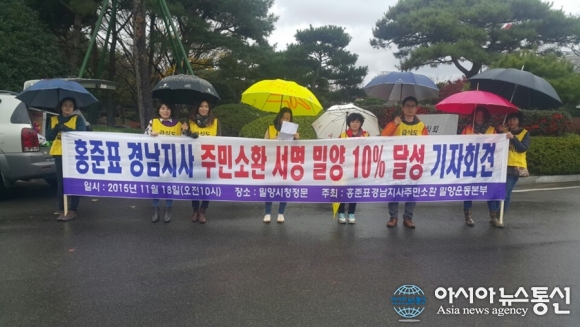 18일 오전 경남 밀양시청 서문에서 '홍준표 경남지사 주민소환 밀양운동본부'가 기자회견을 통해 주민소환 청구인 서명 1만100여명을 달성했다고 밝히고 있다.(사진제공=밀양운동본부) '홍준표 경남지사 주민소환 밀양운동본부'는 18일 ... 2015-11-18