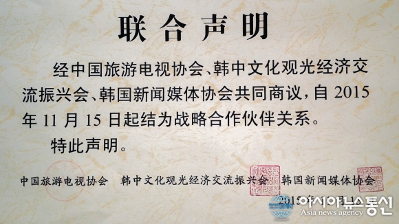 한국언론미디어협동조합(전태수 대표) 중국에는 협동조합 단어가 없어 한국언론미디어협회로 표기, 중국관광TV방송협회(刘生发유생파 회장) ,한국문화관광교류협회(홍진기 회장) 15일 협약서에 조인하고 교환을 했다.(사진제공=중국관광TV방송협회) ... 2015-11-18