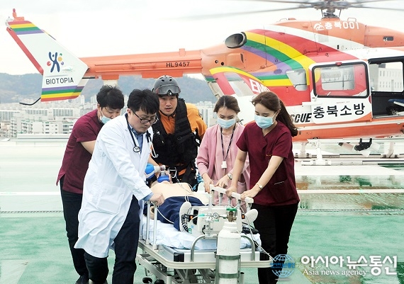 18일 충북대병원과 충북도소방본부가 충북대 병원에서 응급환자 소생률을 높이기 위한 119 구급헬기 훈련을 하고 있다.(사진제공=충북대병원) 응급환자의 소생률을 높이기 위한 119 구급 헬기 훈련이 충북대학교병원에서 열렸다. 충북대병원(원장 조... 2015-11-18