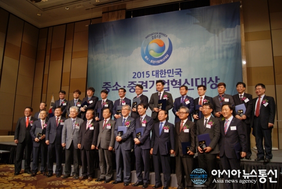 17일 2015 대한민국 중소 중견기업 혁신대상 시상식에서 동반성장 부문 대상(동반성장위원장상)을 수상한 유창근 인천항만공사 사장(오른쪽에서 여섯번째)이 다른 부문 수상자들과 함께 포즈를 취하고 있다.(사진제공=인천항만공사) 인천항만공사(사장 ... 2015-11-18