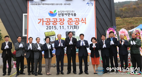 17일 산청유기한우 가공공장 준공식이 열리고 있다.(사진제공=산청군청) 경남 산청군은 17일 차황면 신기마을에서 농업회사법인 (주)산청자연식품(대표이사 이문혁) ‘산청유기한우 가공공장 준공식’을 갖고 산청한우 식품산업 육성사업의 첫 ... 2015-11-18