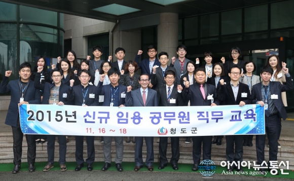 청도군 2015년 신규공무원 직무교육에 참여한 신규임용 공무원들이 이승율 군수와 함께 파이팅을 외치며 단체촬영을 하고 있다.(사진제공=청도군청) 경북 청도군(군수 이승율)은 신규임용 공무원 25명을 대상으로 지난 16일부터 18일까지 3일간 신규공무... 2015-11-18