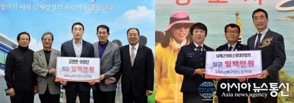 (사)남해군 향토장학회에 장학금 기탁 모습.(사진제공=남해군청) 경남 남해군에 풍요로운 가을을 맞아 지역 후학 양성을 위한 장학금 기탁 행렬이 줄을 잇고 있다. (사)남해군향토장학회(이사장 박영일 남해군수)는 고현면 이장단 100만원, 남해군 의... 2015-11-18