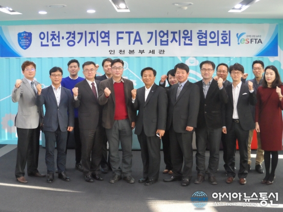 17일 인천본부세관이 인천창조경제혁신센터에서 인천시, 경기도, 중소기업진흥공단 등 FTA 지원사업을 시행하고 있는 11개 기관이 함께하는 올해 하반기 인천·경기지역 FTA 기업지원 협의회를 진행하고 기념촬영을 하고 있다.(사진제공=인천본부세관) ... 2015-11-17