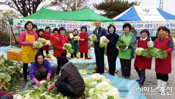 17일 육심교 농업기술센터 소장과 김창완 농촌지원과장이 생활개선회원들이 김장담그는 현장을 찾아 배추를 들고 함께 포즈를 취하고 있다.(사진제공=상주시청) 경북 상주시농업기술센터(소장 육심교) 소속 학습단체인 생활개선 상주시연합회(회장 ... 2015-11-17