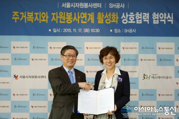 서울시 SH공사와 서울시 자원봉사센터의 '주거복지 분야 자원봉사' MOU 체결모습.(사진제공=서울시) 서울시 SH공사(사장 변창흠)와 서울시자원봉사센터(센터장 박윤애)는 17일 SH공사에서 '주거복지사업 분야 자원봉사'를 활성화하기 위한 MOU... 2015-11-17